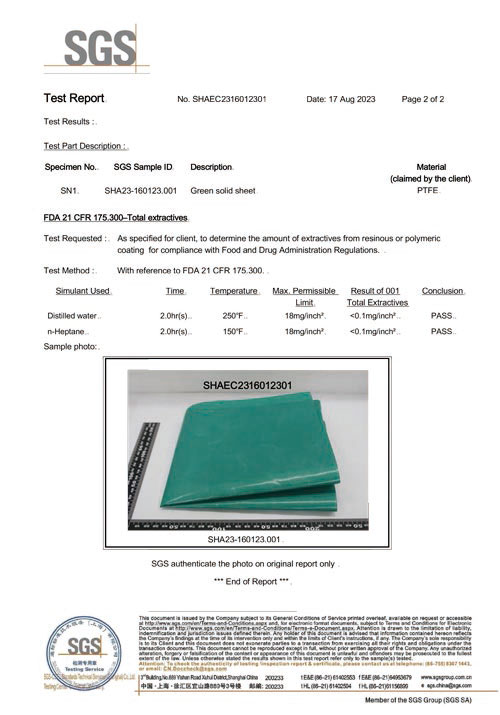 FDA Test Report- Green Color PTFE Coated Fiberglass Fabric